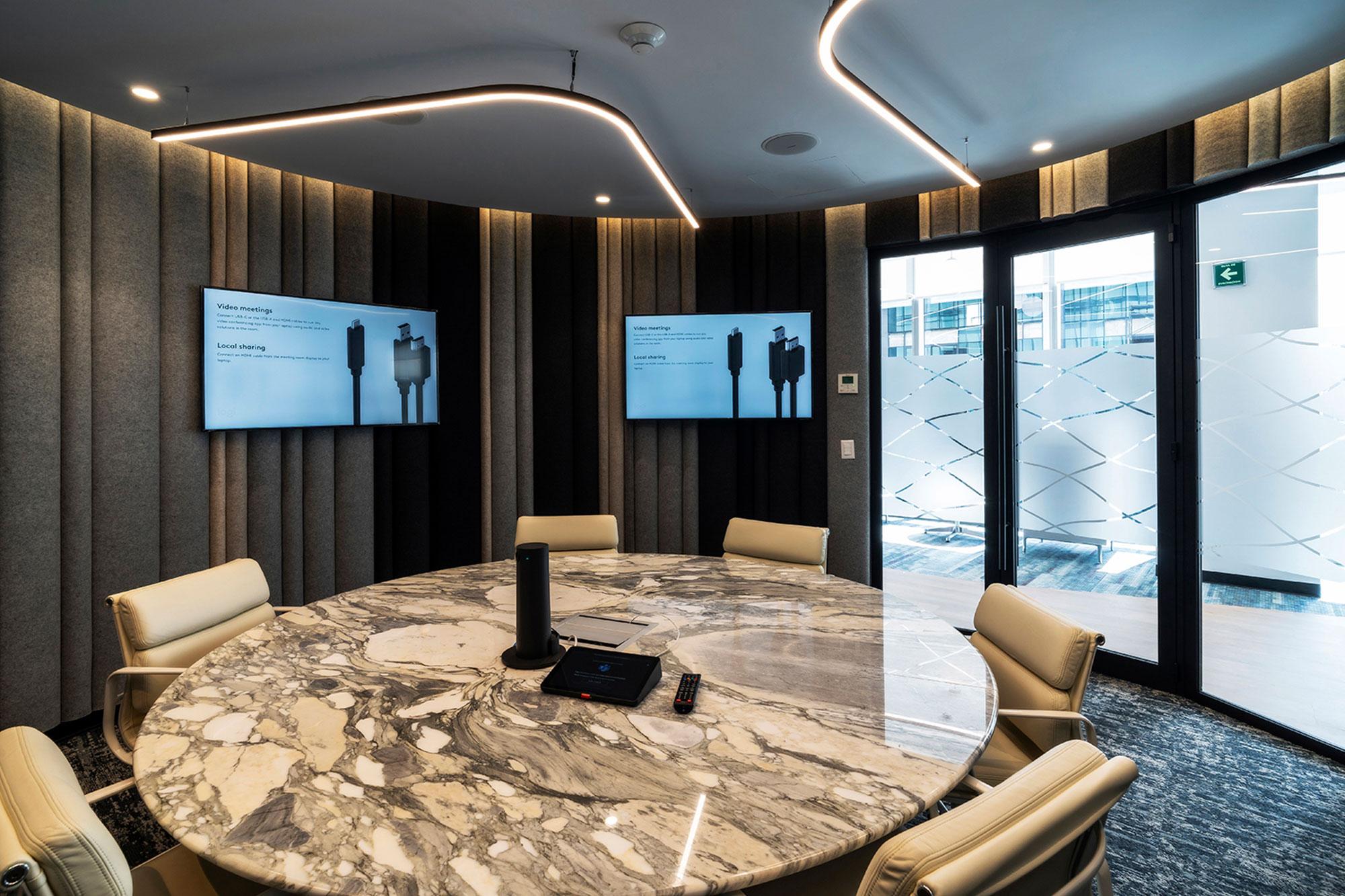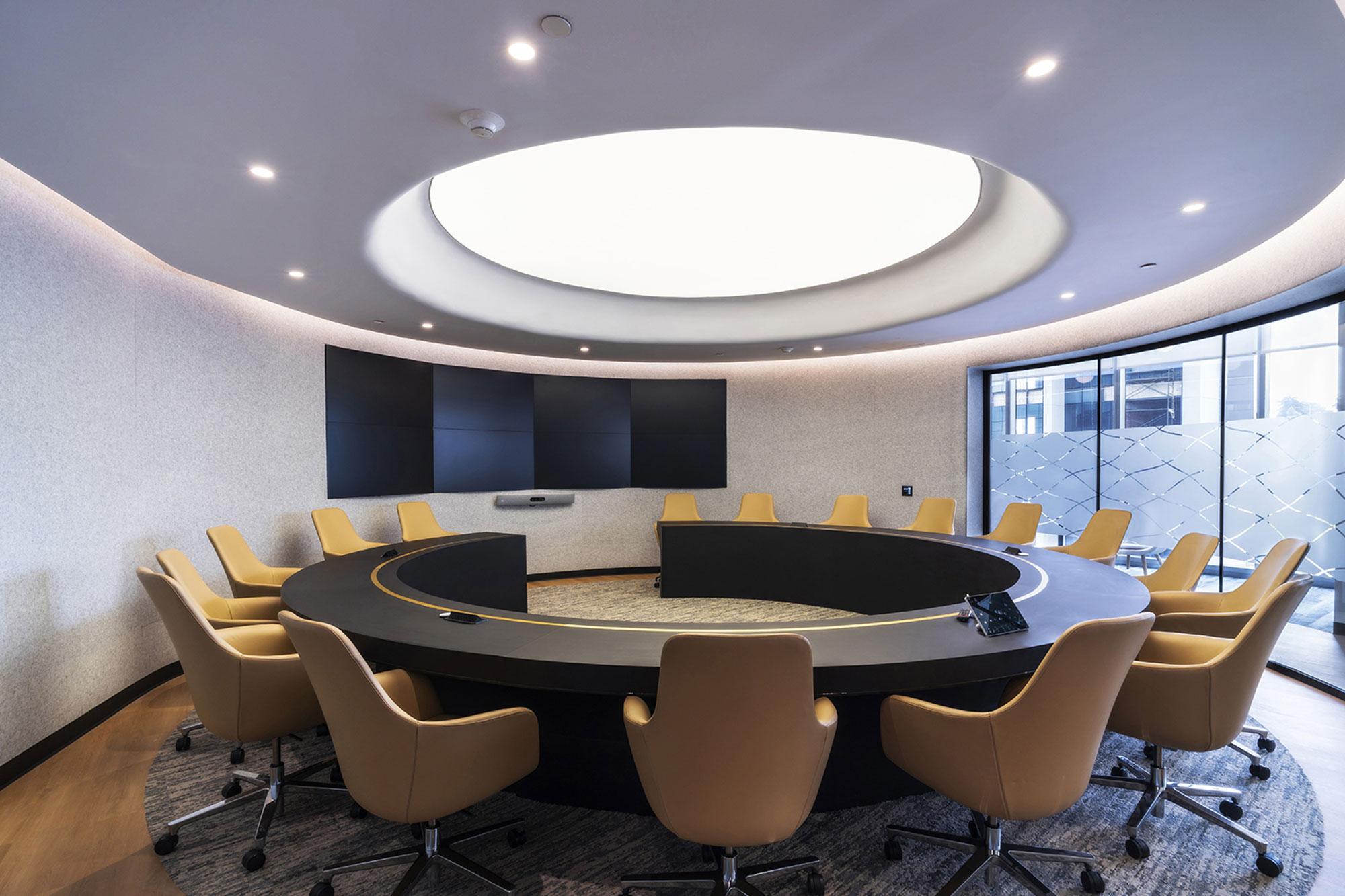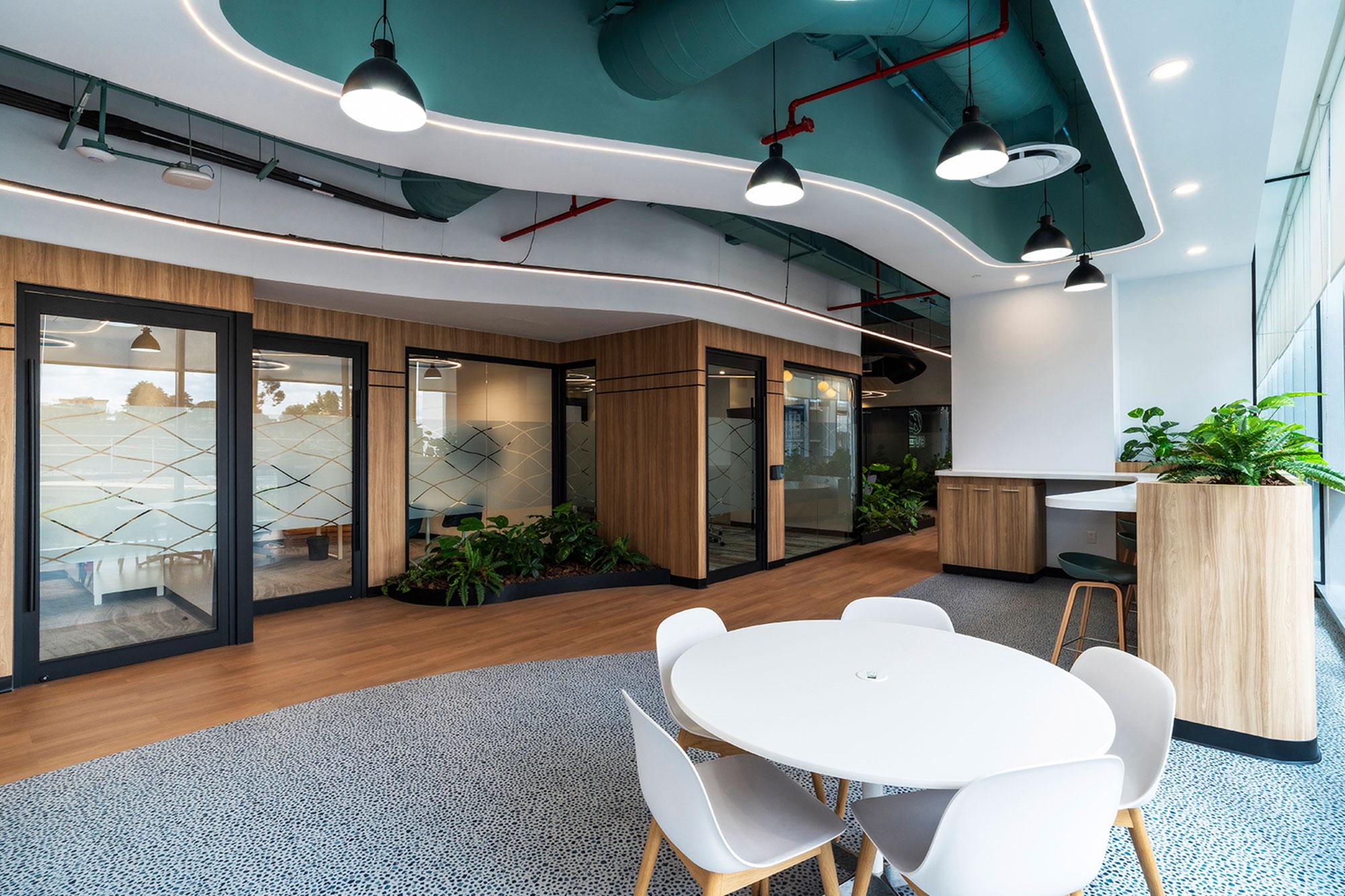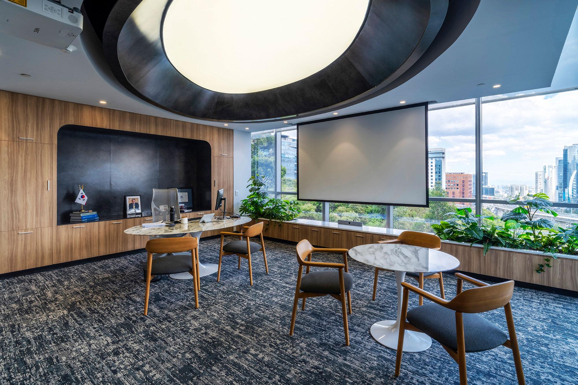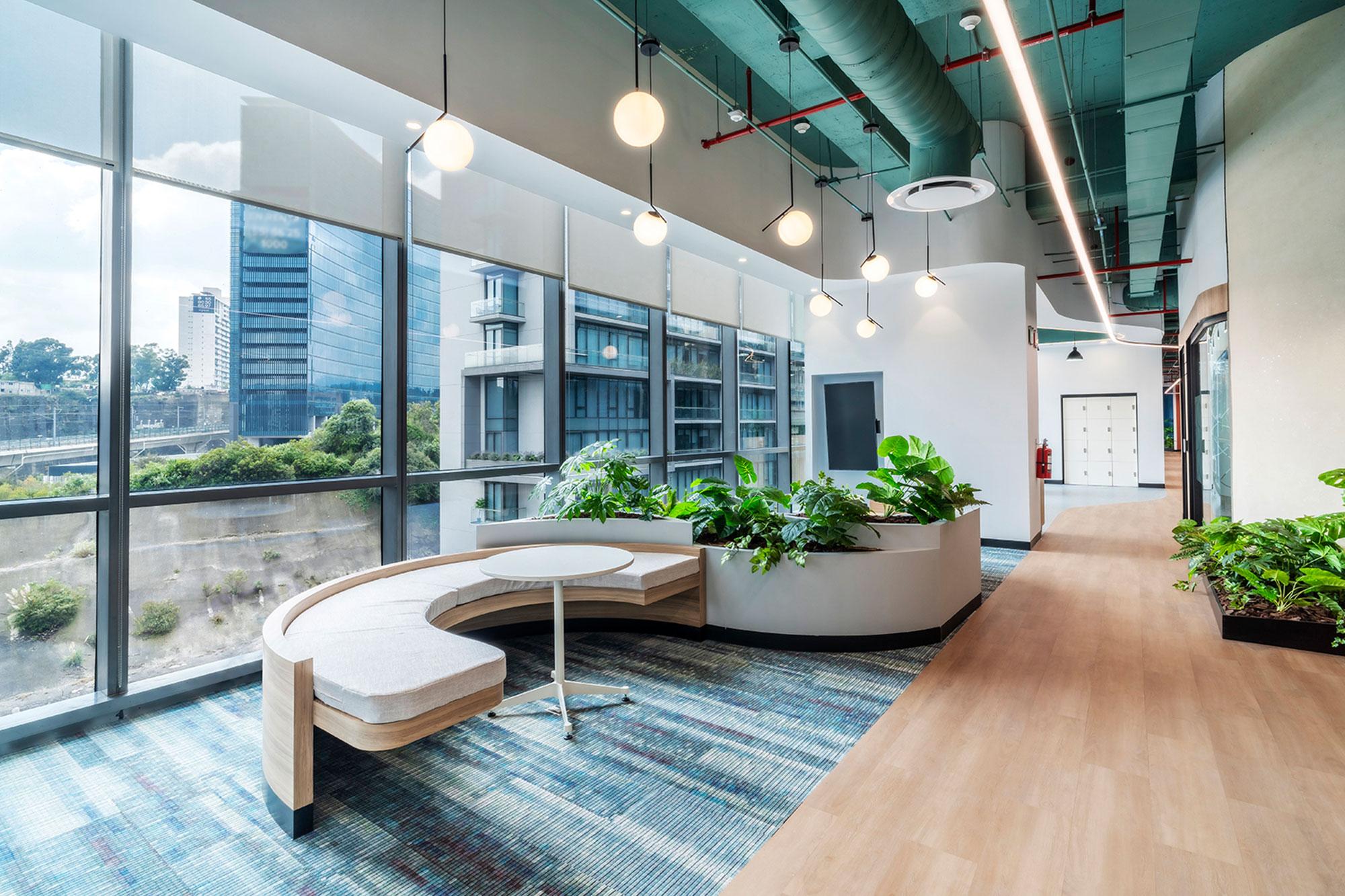 Junto con los arquitectos del proyecto, se desarrolló el look and feel de las nubes acústicas para las áreas abiertas. Esto consistió en crear una solución personalizada para la instalación de nubes acústicas en forma de anillo, con un diámetro fuera de lo estándar (2.40 m). Para lograrlo, la pieza fue diseñada desde cero, dividiéndola en tres secciones independientes y desarrollando una estructura interna que, visualmente, se percibiera como una sola unidad. Uno de los principales retos fue incorporar un sistema de ensamblaje en sitio, lo cual también implicaba planificar la logística para transportarlas sin utilizar el montacargas, ya que su uso no estaba permitido. Esta situación se resolvió ensamblando las piezas directamente en el lugar de instalación.
